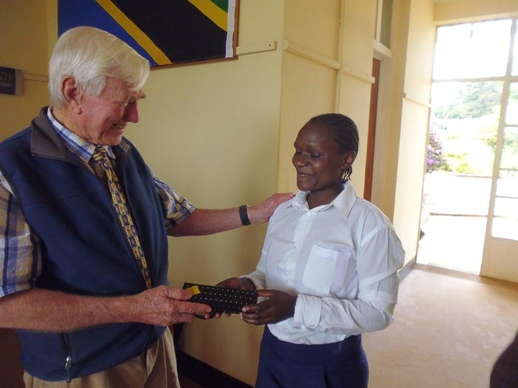 Anicetta Gregory, (pictured above receiving a pen from headmaster Ken Langford-Smith) is one of the mature-age students at Katoke-Lweru Secondary School.